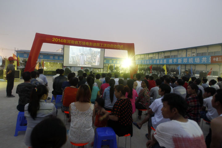 6月10日晚8時(shí), 鄭州機(jī)場(chǎng)二期工程建設(shè)工地中建三局新鄭機(jī)場(chǎng)T2航站樓項(xiàng)目指揮部大院內(nèi)人聲鼎沸、歡歌陣陣,由中共河南省委宣傳部、河南省廣電局、鄭州機(jī)場(chǎng)二期工程建設(shè)指揮部主辦,鄭州市文化廣電新聞出版局、河南新農(nóng)村數(shù)字電影院線有限公司、鄭州商都數(shù)字電影院線有限公司、中建三局新鄭機(jī)場(chǎng)T2航站樓項(xiàng)目部承辦的2014年河南省萬場(chǎng)電影送民工活動(dòng)啟動(dòng)儀式如期舉行,300余名鄭州機(jī)場(chǎng)二期工程參建人員興致勃勃地觀看了河南影視制作集團(tuán)出品的《永遠(yuǎn)的焦裕祿》和《新少林寺》等影片。河南省委宣傳部常務(wù)副部長(zhǎng)王耀;河南省新聞出版廣電局黨組副書記、副局長(zhǎng)宋鳳仙;鄭州機(jī)場(chǎng)二期工程建設(shè)指揮部副指揮長(zhǎng)、河南城際鐵路公司常務(wù)副總經(jīng)理劉光明等領(lǐng)導(dǎo)同志出席了啟動(dòng)儀式。